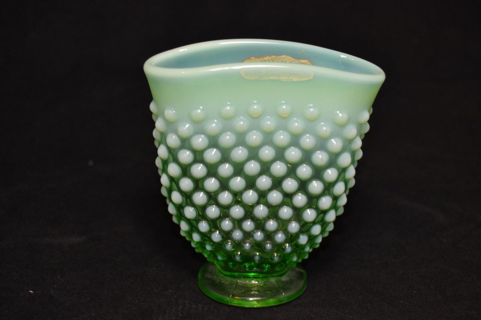 Fenton Green Opolescent Vaseline Milk Glass Hobnail Vase