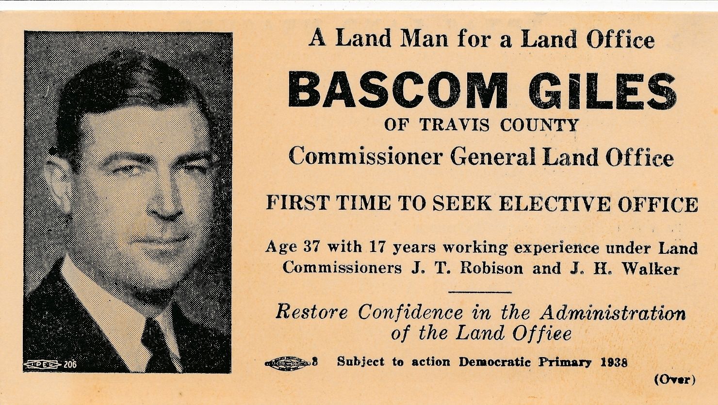 1938 Bascom Giles for State Land Commissioner card Texas TX