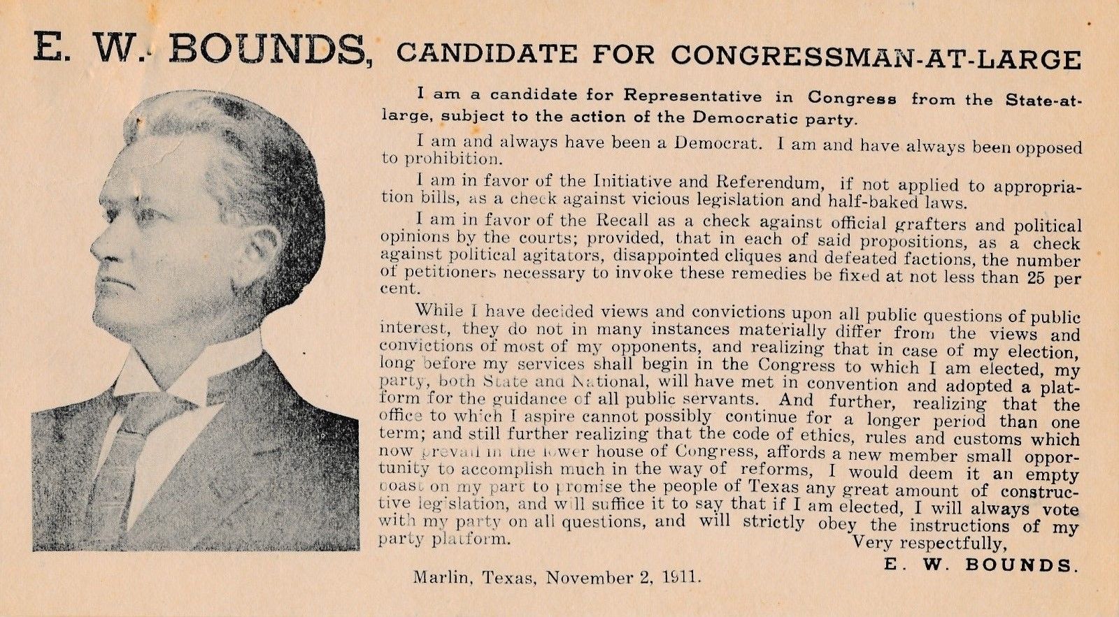 1911 E. W. Bounds for U.S. Congress 7 1/2" X 4" card Texas TX