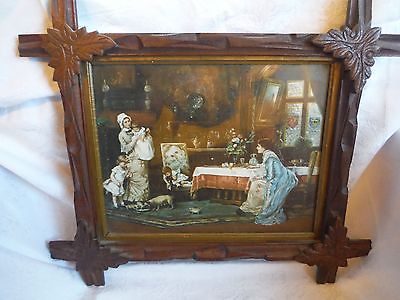 Vintage Carved Wood Oak Leaf Picture Frame with Old Print