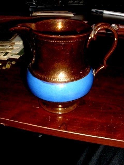 LUSTERWARE LARGE PICHER GOLD AND BLUE 6" TALL X 3'' W