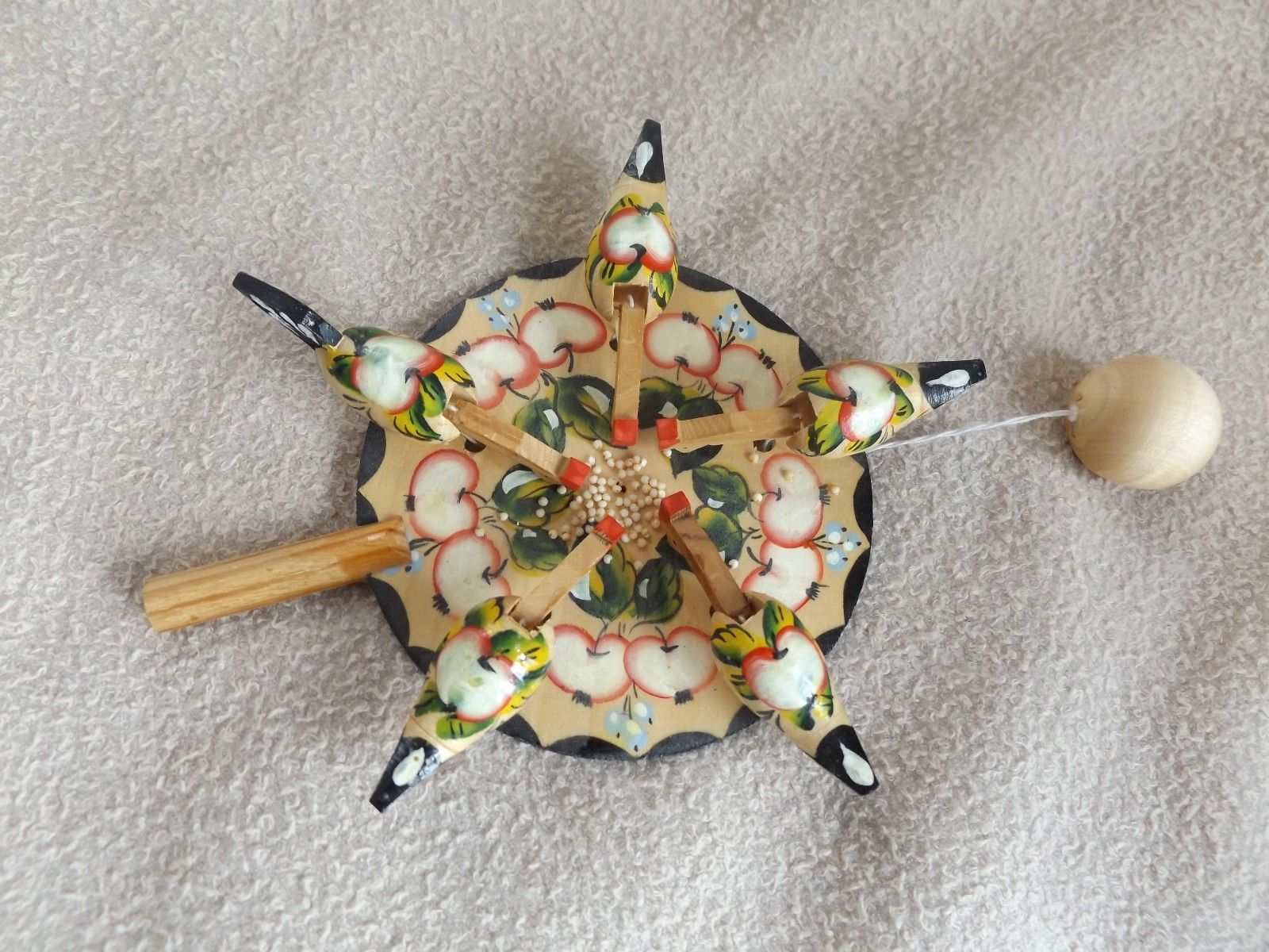 Title (ebay affiliate link): Vintage Hand Carved Folk Art Toy 4 Pecking Chickens & a Rooster Wood Paddle Game