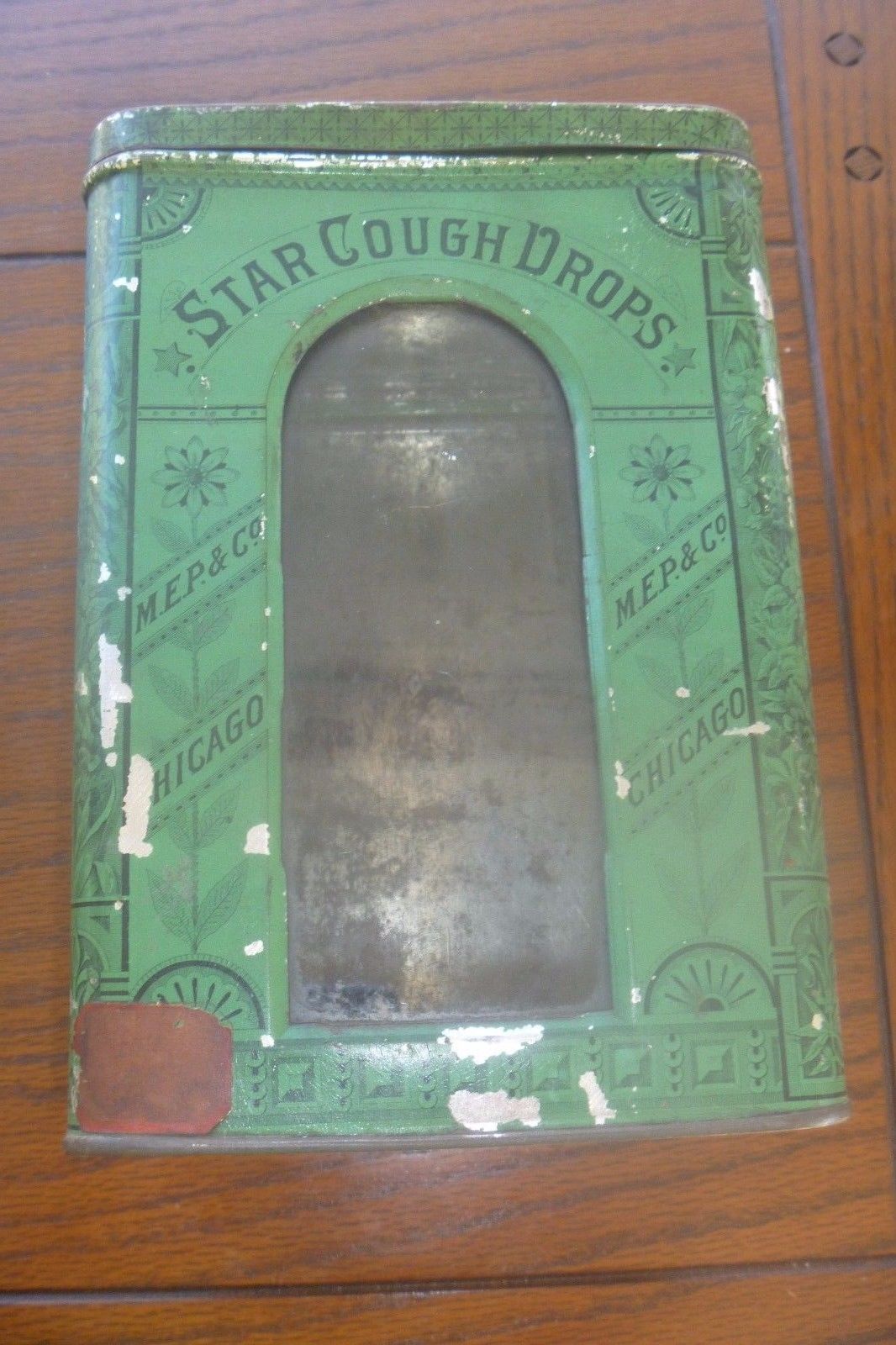 Title (ebay affiliate link): M.E. PACE CHICAGO STAR COUGH DROP GLASS FRONT TRIAL STORE TIN