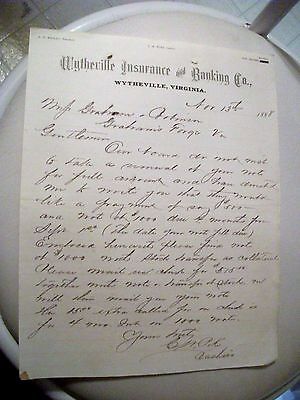 Collectible 1888 Letter Head "WYTHEVILLE INSURANCE & BANKING CO." Wytheville,Va