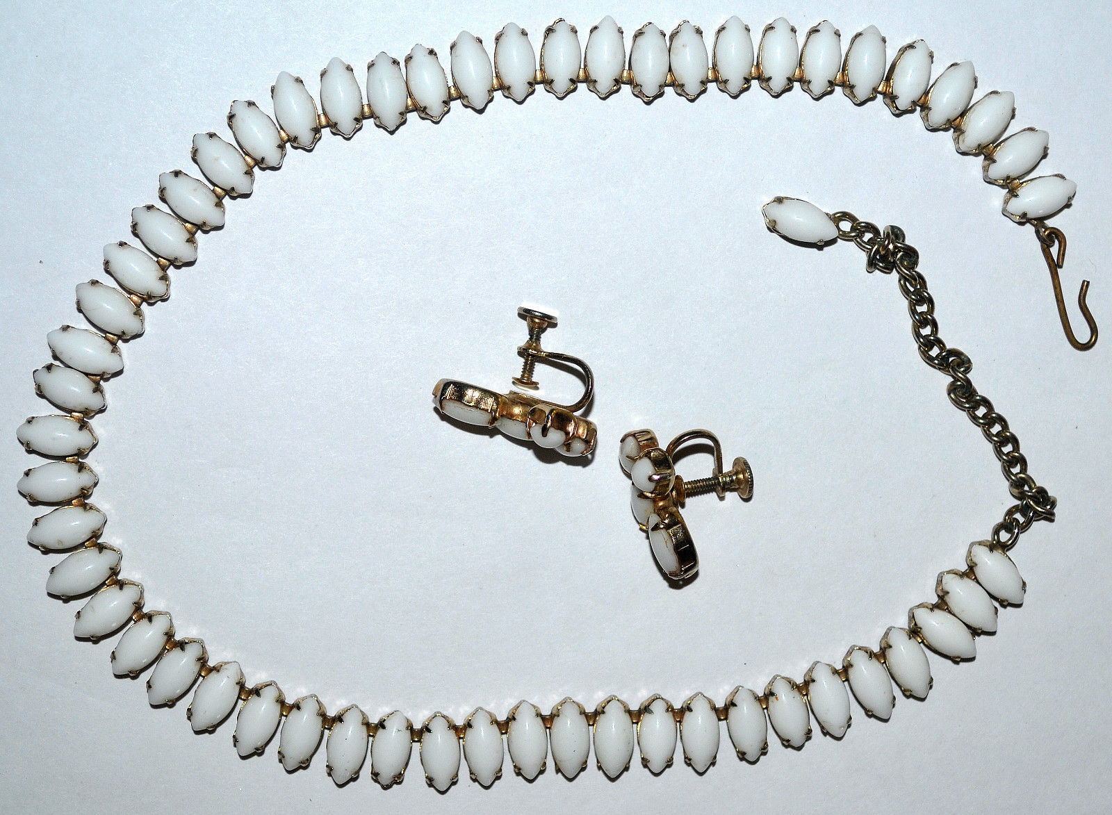 Title (ebay affiliate link): VINTAGE HIGH END WEISS MILK GLASS NECKLACE & SCREW BACK EARRING SET