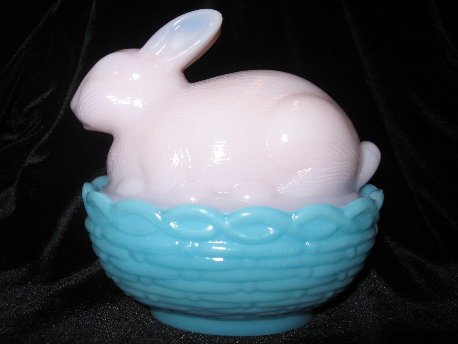Pink Blue milk glass bunny rabbit on nest basket candy easter eggs crown tuscan