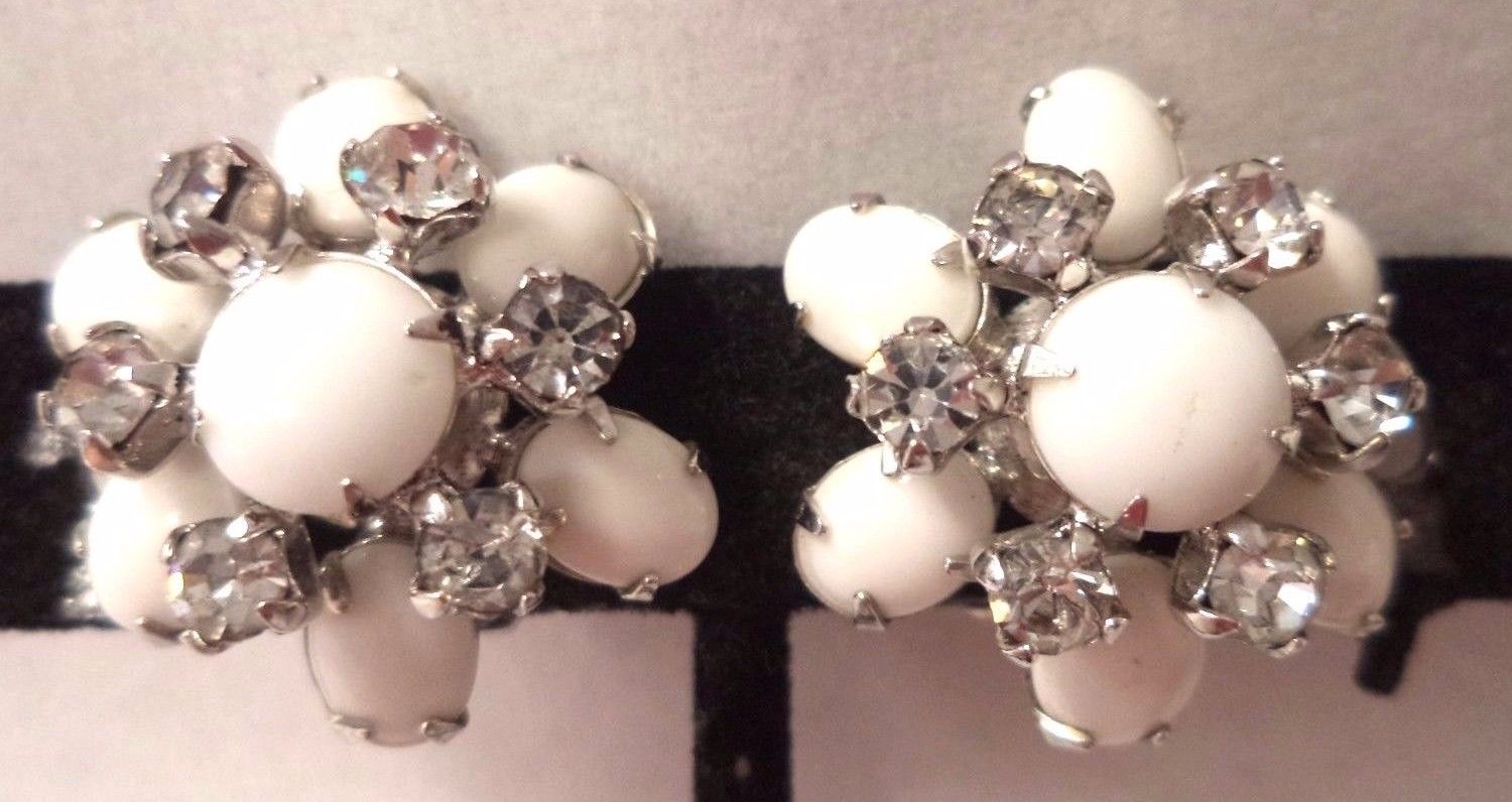 Title (ebay affiliate link): STUNNING VINTAGE HIGH END MILK GLASS RHINESTONE 1" CLIP EARRINGS MINTY!!! G1583
