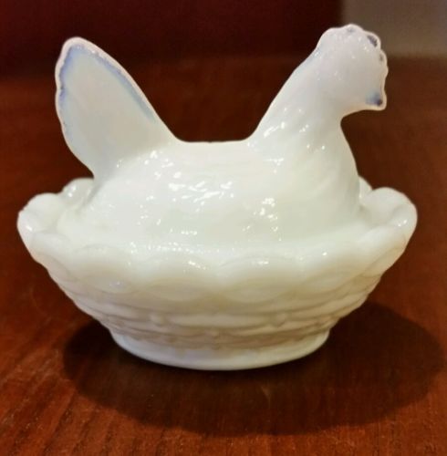 Title (ebay affiliate link): VINTAGE Smaller Miniature Milk Glass HEN ON NEST Chicken Rooster Trinket