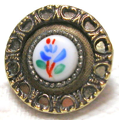 ANTIQUE HAND PAINTED BLUE FLOWER MILK GLASS JEWEL BUTTON w/TWINKLE HEART RIM