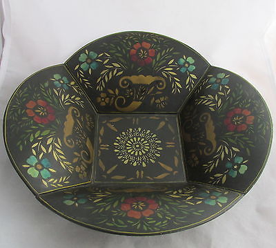 Vintage Hand Painted Stencil Flower Cornucopia on Black Metal Toleware Bowl