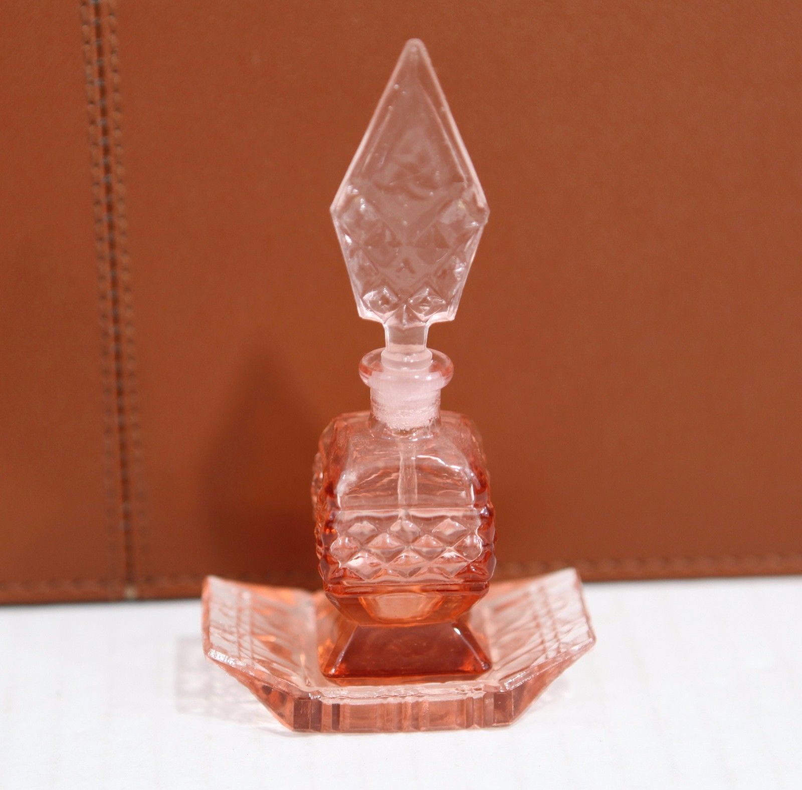 Pink Depression glass perfume bottle and vanity stand - Beautiful!