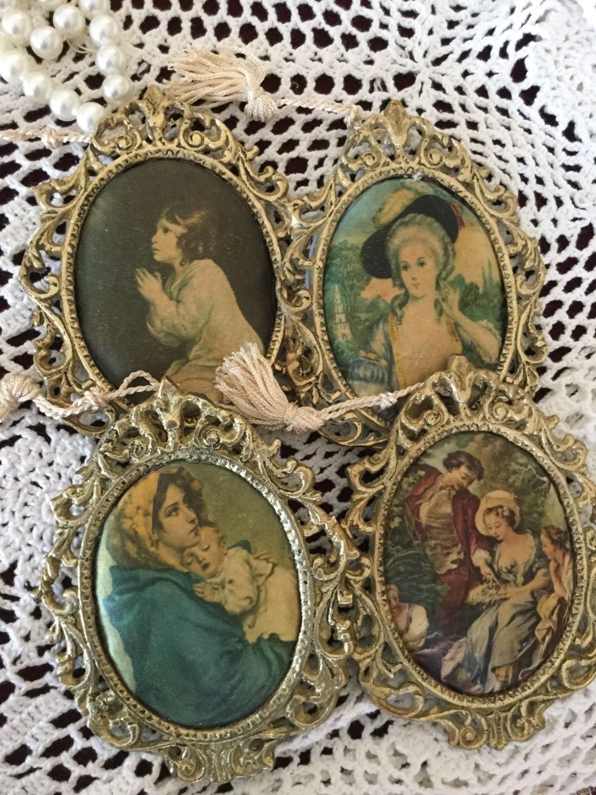 Title (ebay affiliate link): 4 Vintage Ornate Brass Oval Picture Frames w/Silk Prints, Milano, Italy