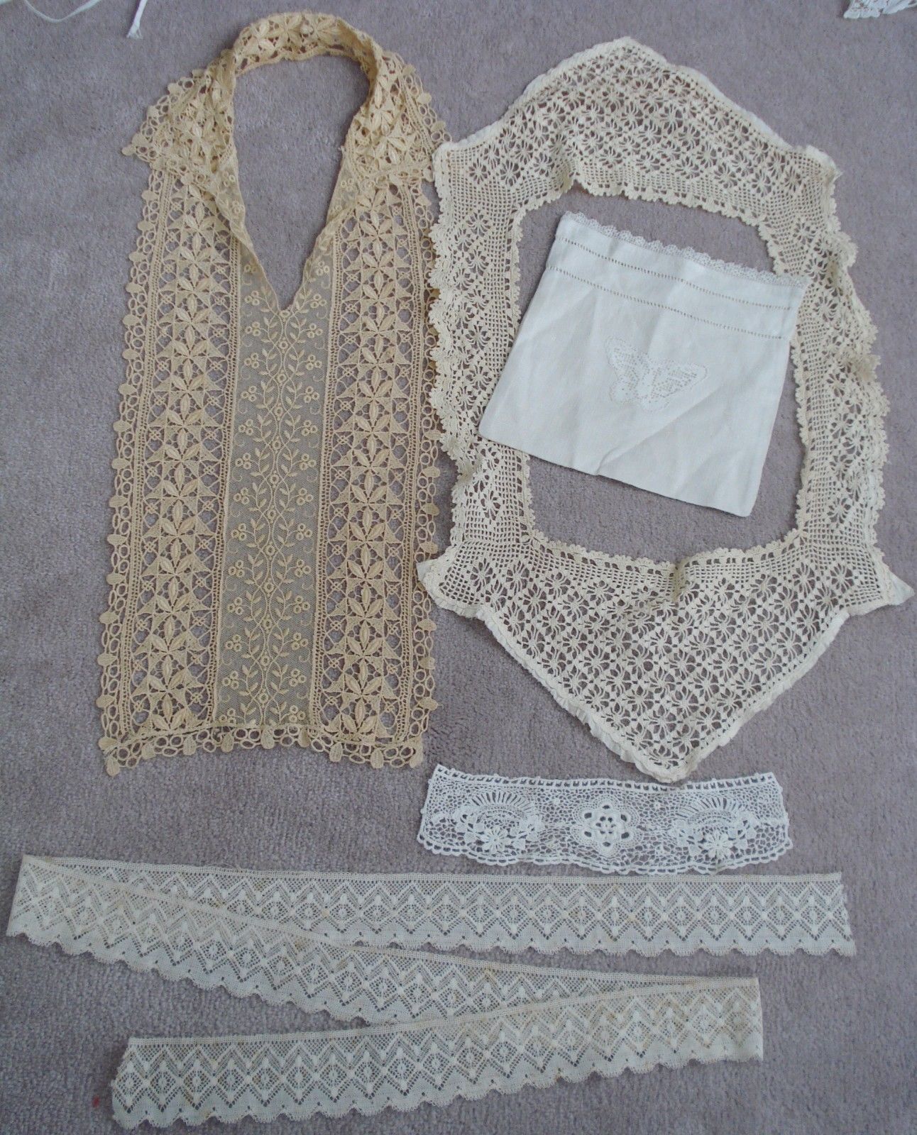 LOT ANTIQUE EDWARDIAN COLLAR LACE CROCHET BUTTERFLY BAG TRIM EDGING DOLL VINTAGE