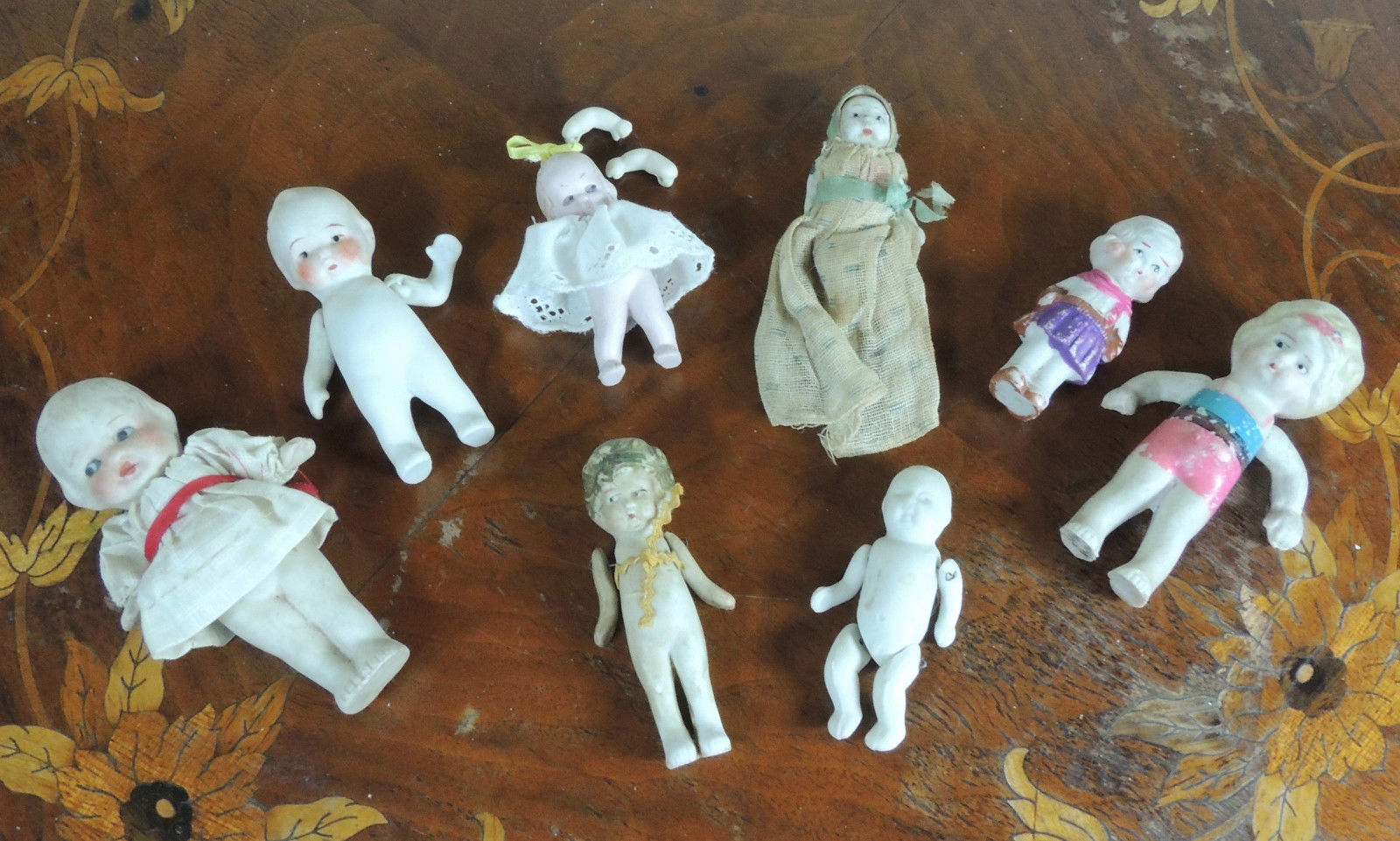 Nice Large Lot of Antique & Vintage All Bisque Carnival & Doll House Dolls Japan