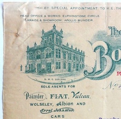 India Bombay Motor Car Co. Daimter FIAT Vulcan 1912 illustrated letterhead