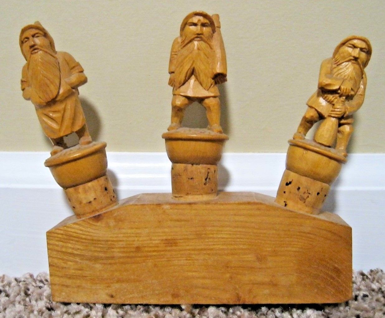 VINTAGE SET OF 3 HAND CARVED WOODEN GNOME BOTTLE STOPPERS WITH DISPLAY STAND