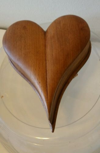 ANTIQUE FOLK ART WALNUT WOOD HEART SHAPED JEWELRY/TRINKET BOX