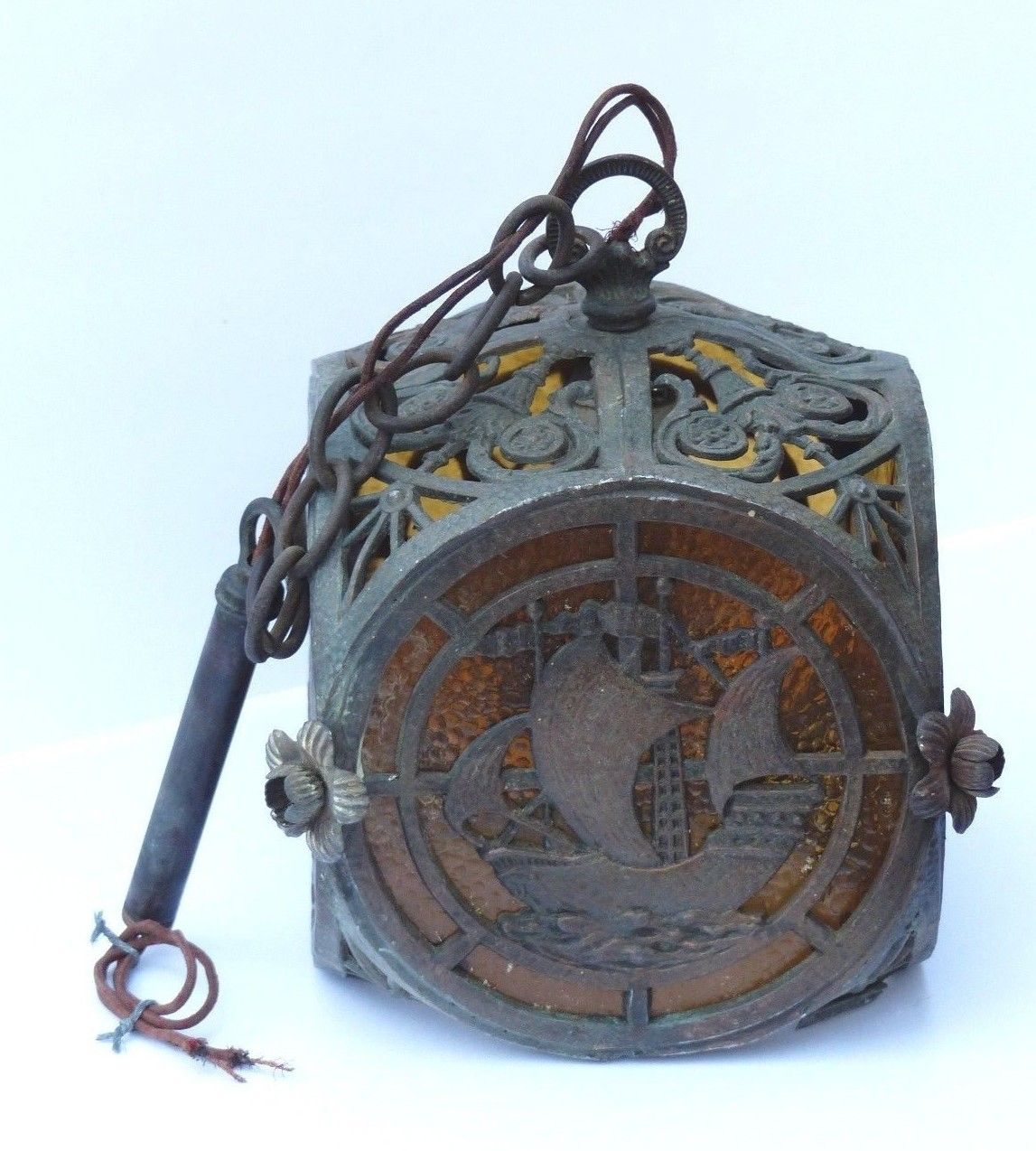 ANTIQUE 4 SIDED AMBER GOLD GLASS VIKING SHIP NAUTICAL LANTERN CHAIN CEILING LAMP