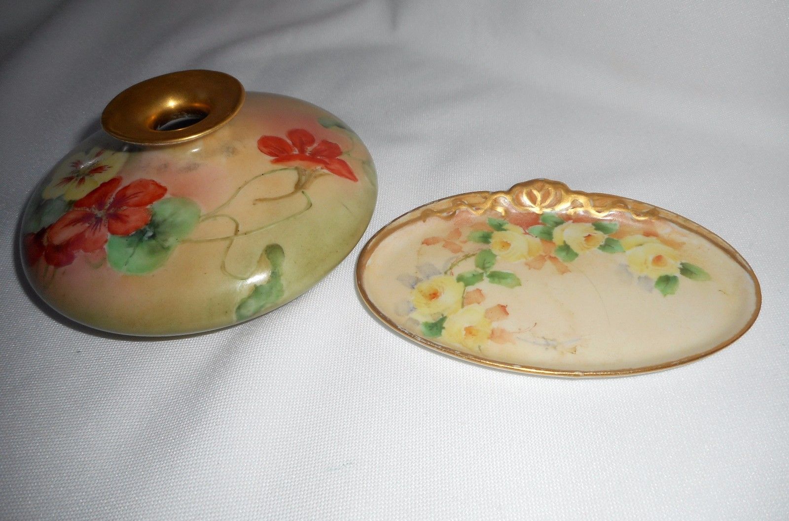 antique LIMOGES SQUAT VASE & RING TRAY hand-painted c 1910 Signed 2 pcs SIGNED