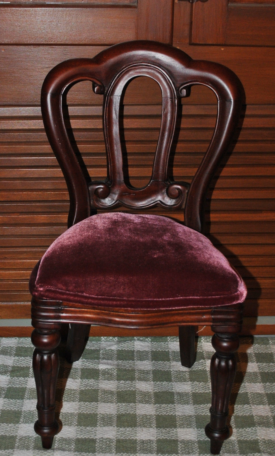 Title (ebay affiliate link): Vintage Chair Carved Mahogany with Velvet Seat Doll or Child Size