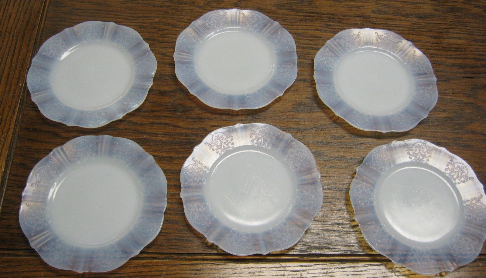 Title (ebay affiliate link): (6) Vintage Embossed Opaque White Milk Glass Round Dessert or Cake Plates
