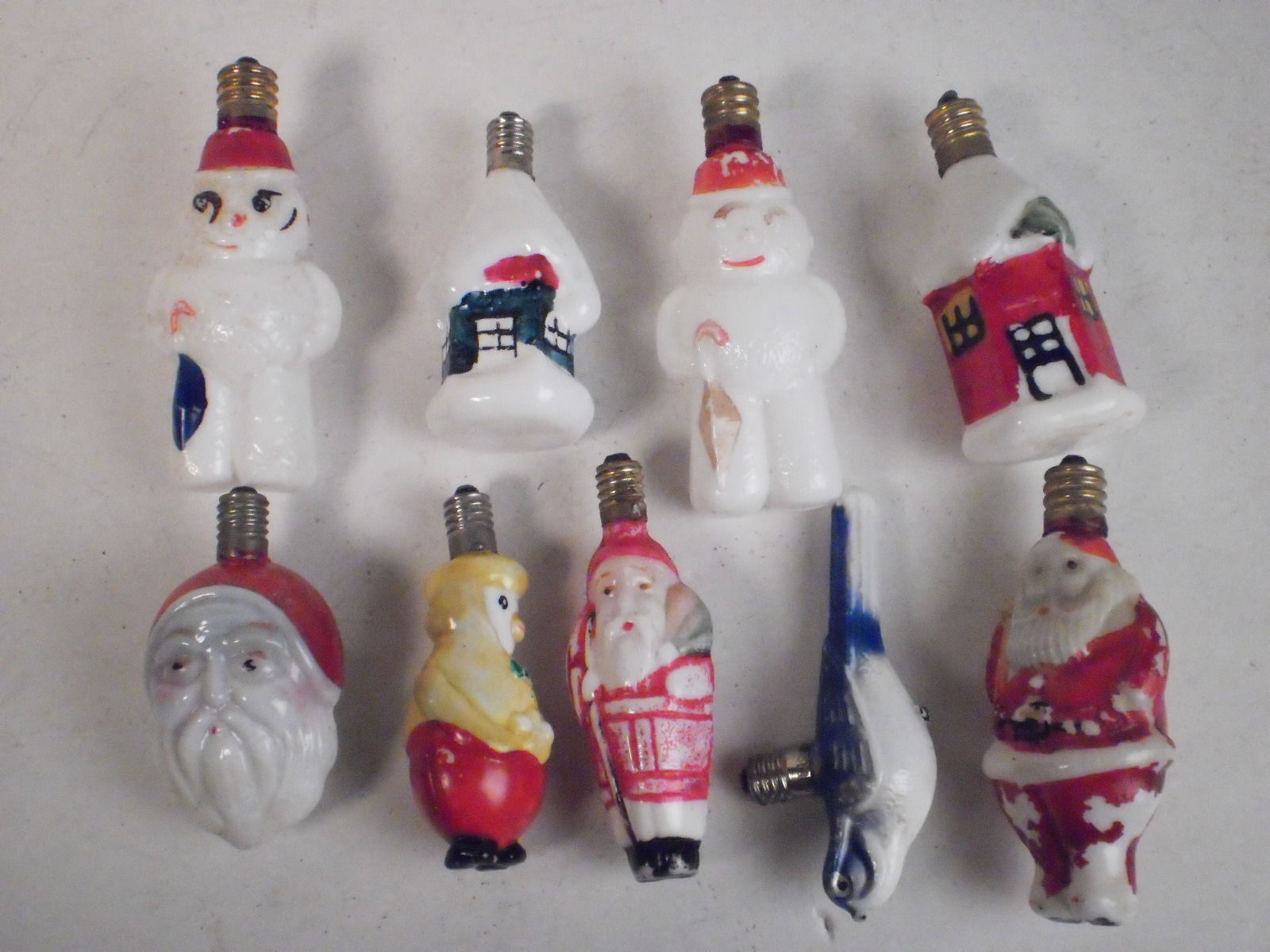 VINTAGE MILK GLASS *9 CHARACTER CHRISTMAS LIGHT BULB LOT* SANTA SNOWMAN.