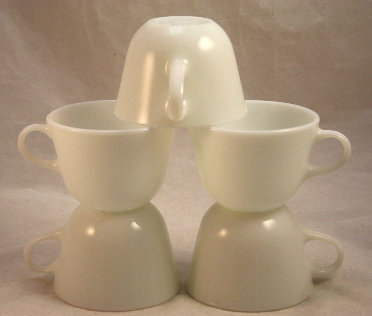 Title (ebay affiliate link): (5) Vintage PYREX Plain Solid White Opal Coffee Tea Cups Mugs Milk Glass