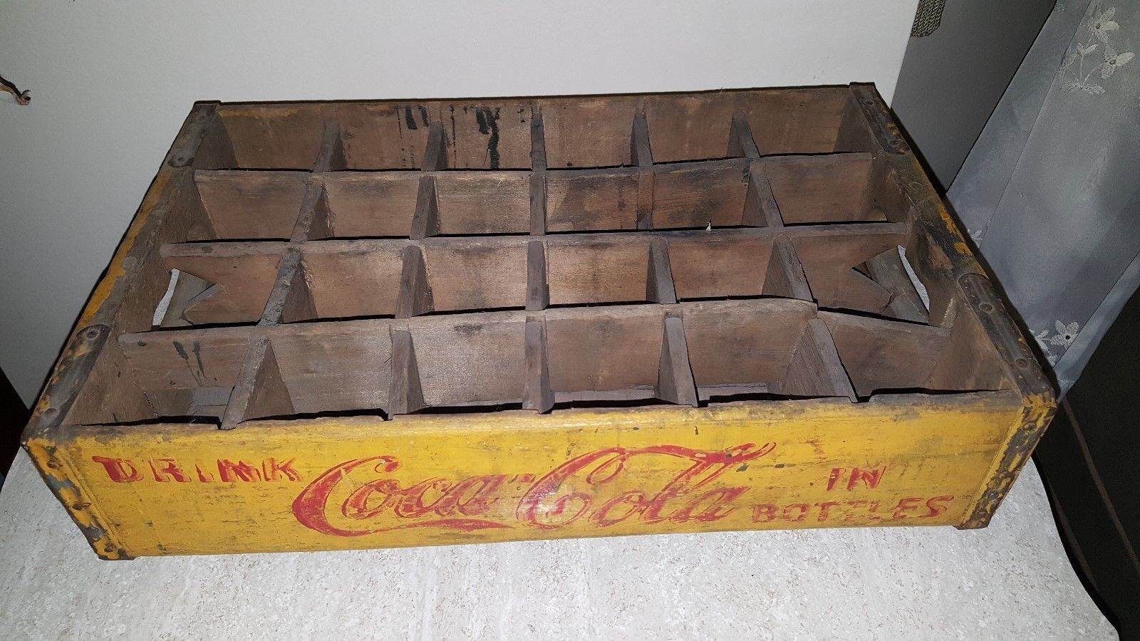 vintage yellow coca-cola wood crate-holds 24 bottles