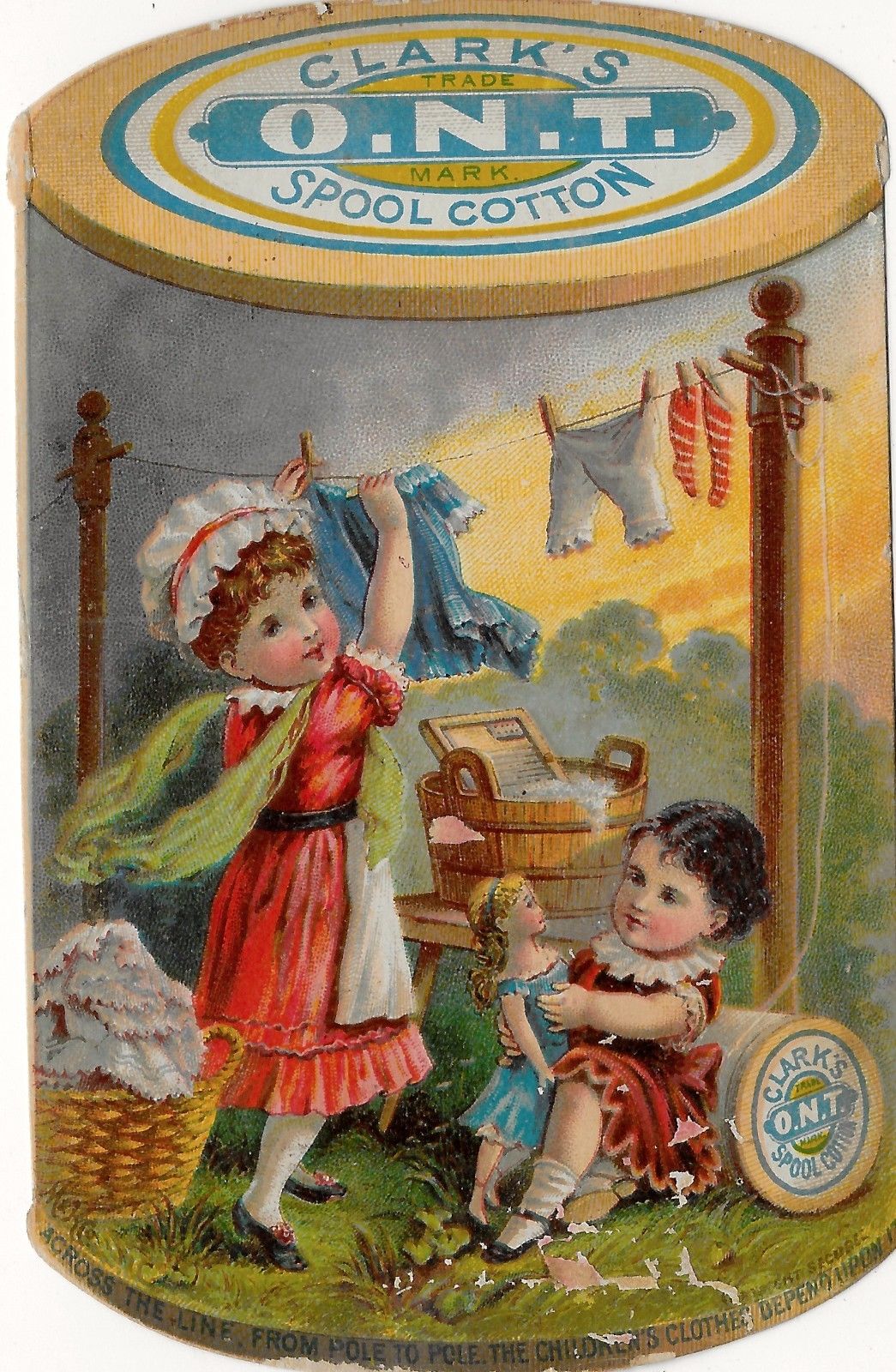 DIE-CUT Large ~ CLARK''S O.N.T. SPOOL, "CLOTHES LINE" VICTORIAN ADVERTISING