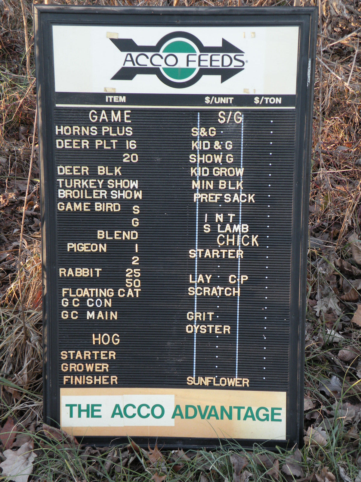 Vintage ACCO Feeds Menu Board General Store Sign Farm Seed Agriculture Texas