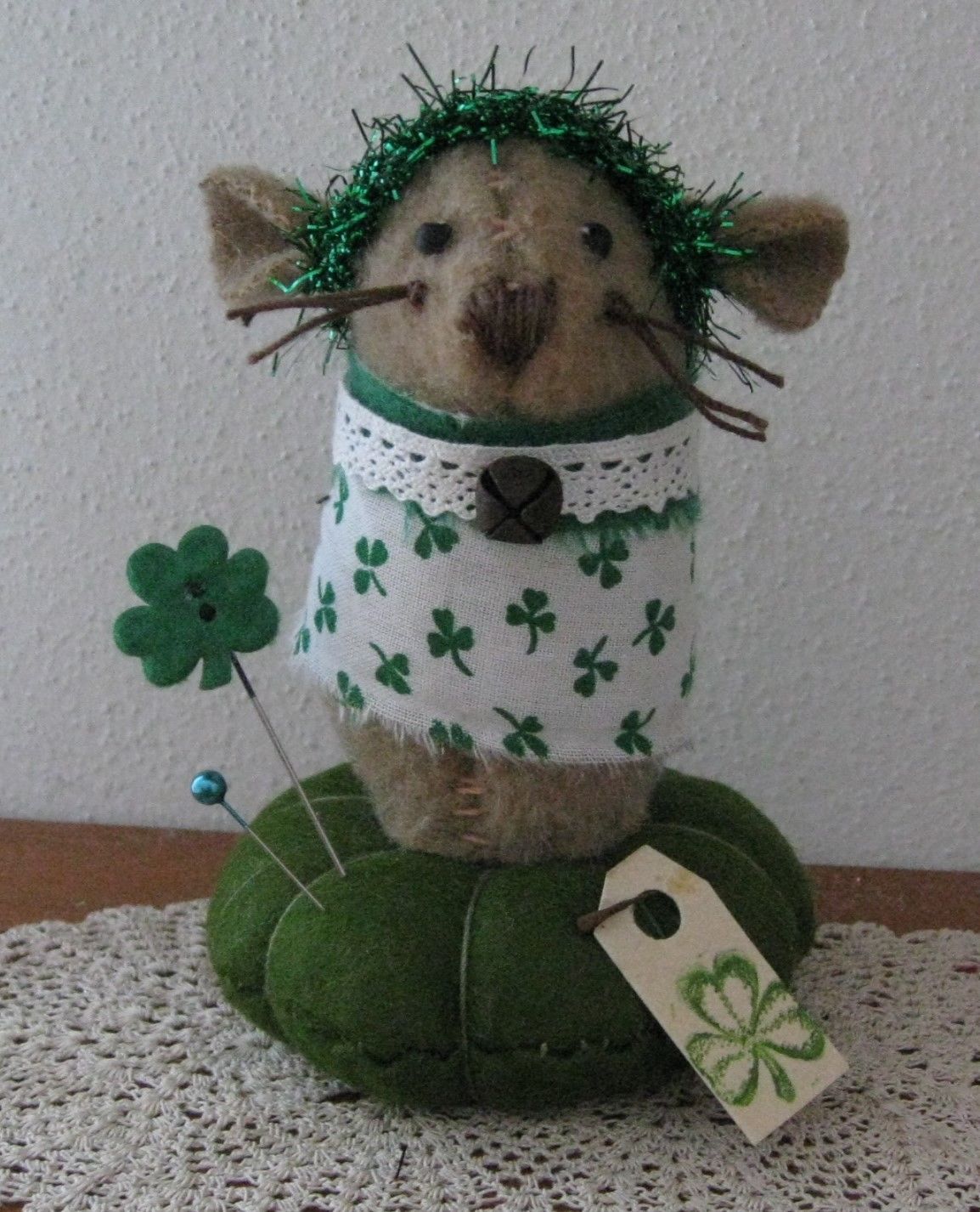 Title (ebay affiliate link): PRIMITIVE WOOL SHAMROCK ST PATRICKS DAY MOUSE MAKE DO PIN CUSHION PFATT