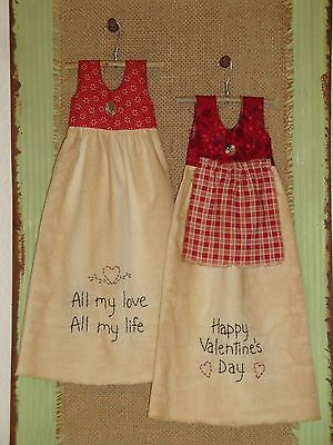 Two Primitive Doll Dresses-Folkart-Handmade Stitchery-Home Decor-Valentine''s Day