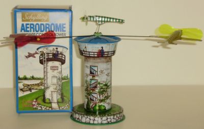 Vintage Schylling Aerodrome Airplane Tower Tin Toy NIB