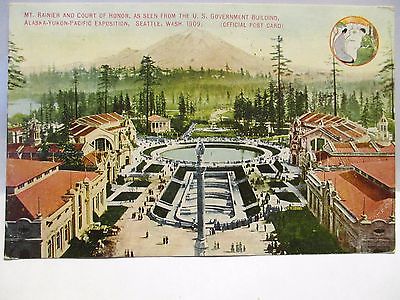 1909 ALASKA-YUKON EXPO POSTCARD MT RAINIER & CT OF HONOR , GOVT BLDG W/ LOGO