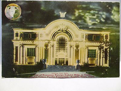 1909 OFF ALASKA-YUKON EXPO X 130 POSTCARD END EUROPEAN EXHIBIT BLDG NIGHT LOGO