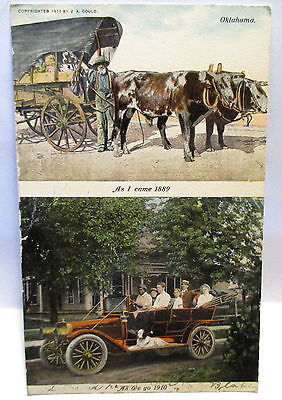 1911 POSTCARD AS I CAME IN 1889-AS WE GO IN 1910,COVERED WAGON & EARLY CAR