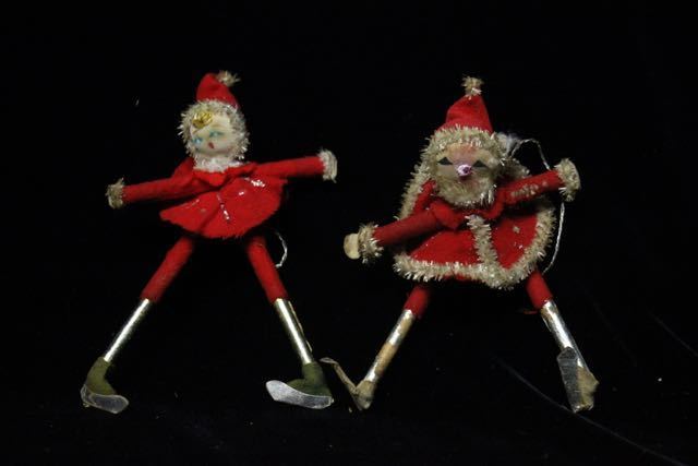 Title (ebay affiliate link): 2 ANTIQUE VICTORIAN SANTA ELVES CHRISTMAS ORNAMENTS ICE SKATING FELT SPUN COTTON