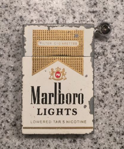 Title (ebay affiliate link): Vintage 1970s Lighter Marlboro Lights Cigarette Metal Case Butane Keychain Mini