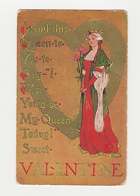 Vintage VALENTINE Postcard, EMBOSSED, QUEEN, TIARA, Gilt Heart Inset