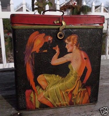 Title (ebay affiliate link): ANTIQUE ADVERTISING IVINS COOKIE TIN BOX ART DECO PARROT FLAPPER VINTAGE OLD