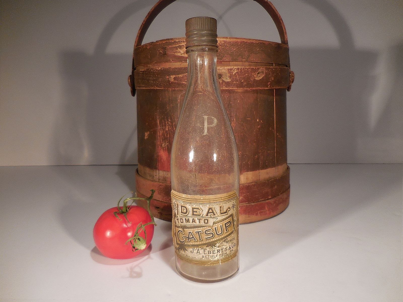 AAFA Early PA Blown Mold Glass Tin-Top Ketchup Bottle Ideal Tomato Catsup Label