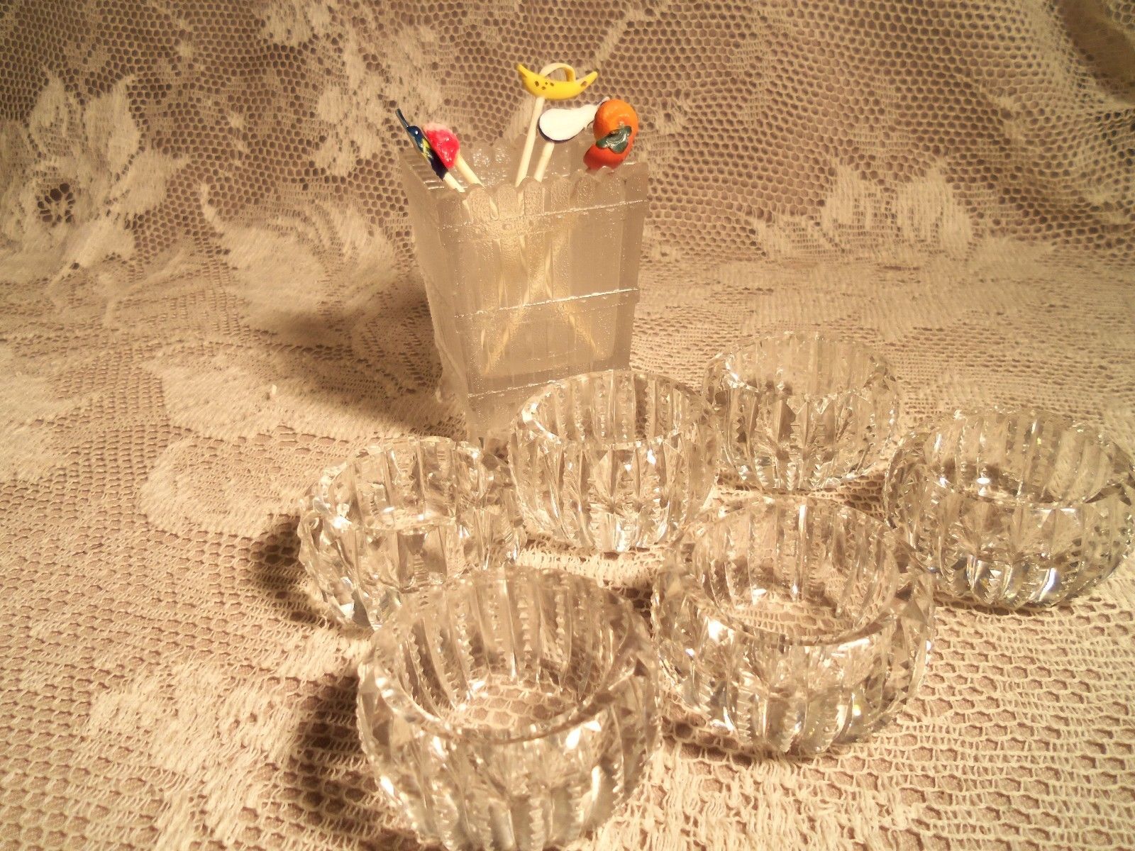 ANTIQUE SET 6 CUT GLASS ZIPPER SALT SELLERS-DIP + TOOTHPICK HOLDER & PICKS