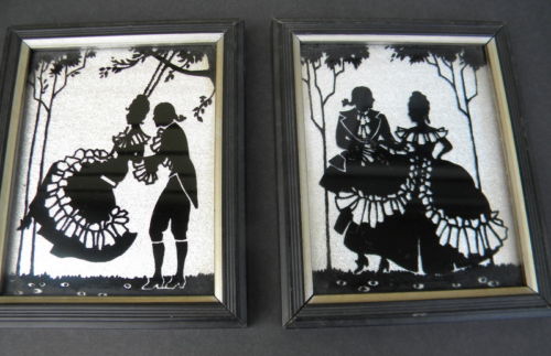 Title (ebay affiliate link): Pair Antique Silhouette Framed Pictures Reverse Glass Paint Courtship Couple