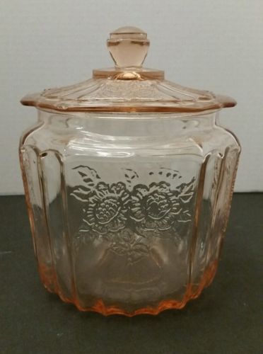 Title (ebay affiliate link): Anchor Hocking Mayfair Open Rose Pink Depression Glass Biscuit Cookie Jar w/ Lid