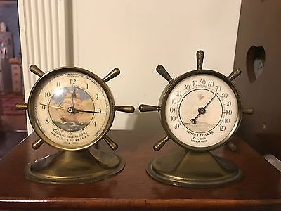 Vintage Brass Ship Wheel Clock & Thermometer USA