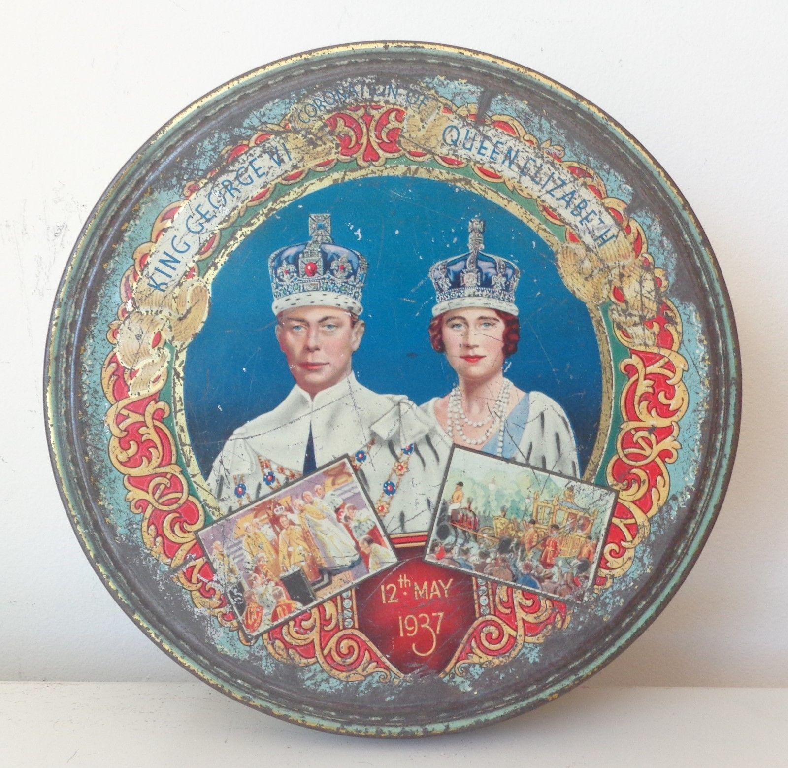 Title (ebay affiliate link): LARGE ROUND 1937 BISCUIT TIN CORONATION OF KING GEORGE VI AND QUEEN ELIZABETH