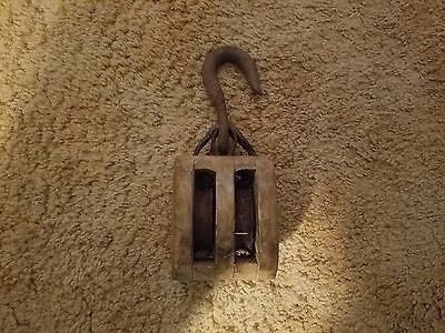 Antique Wood Iron Ship Pulley / Vintage Industrial dual Rope Hoist barn fresh
