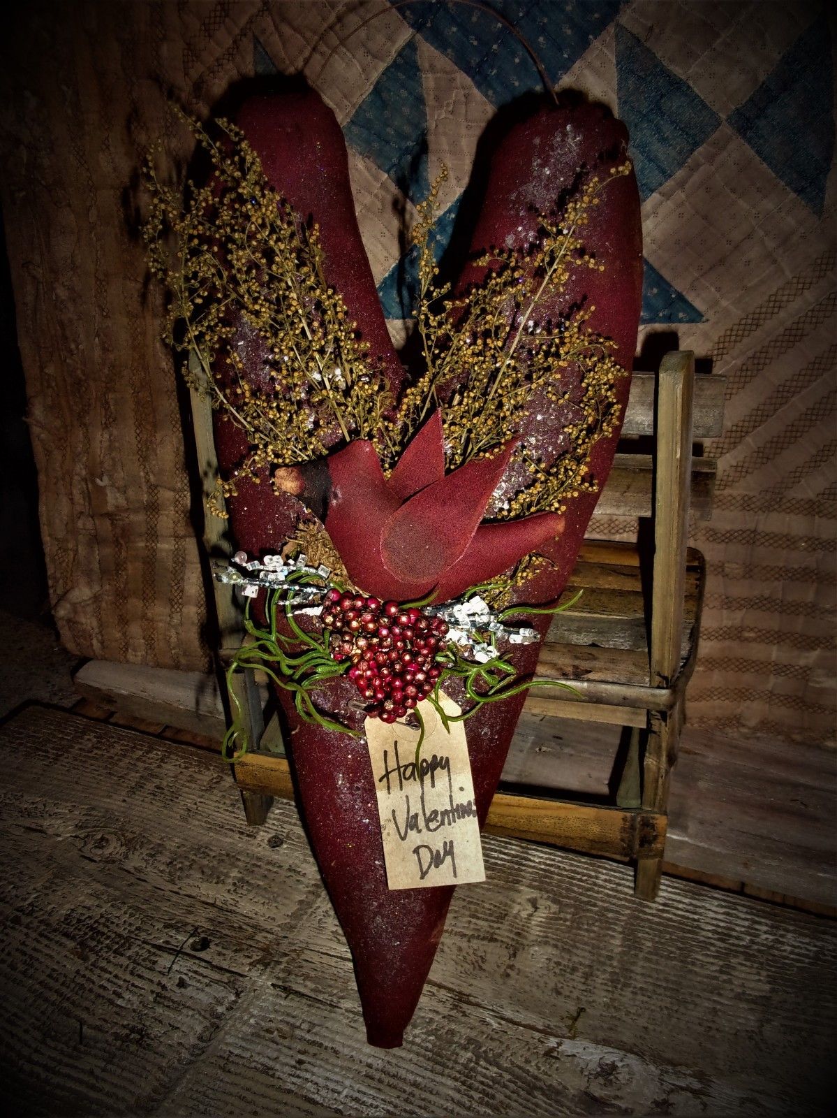 Title (ebay affiliate link): ** Primitive 16x7in Burgundy Heart Hanger Sparkled Country WINTER Rusty doll**