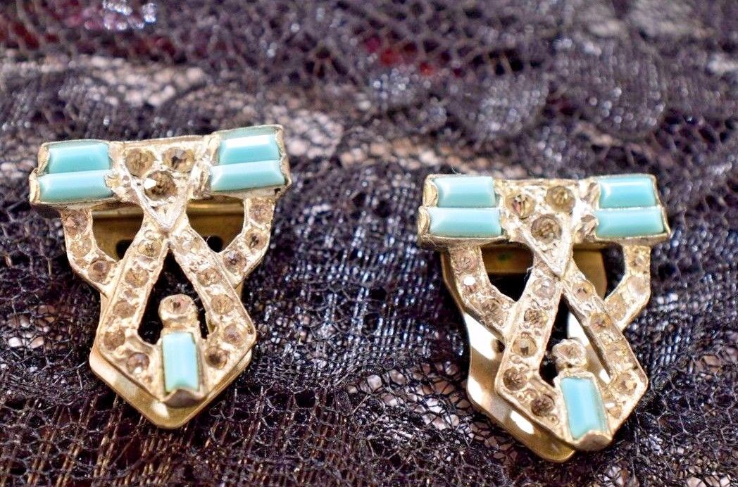 Title (ebay affiliate link): ANTIQUE PAIR CRYSTAL RHINESTONE & BLUE MILK GLASS BAGUETTE SCARF CLIP LOT 831