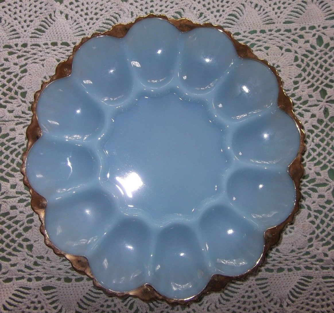 Title (ebay affiliate link): Vintage Blue Milk Glass 10" Deviled Egg Plate - 22k Gold Trim - Anchor Hocking